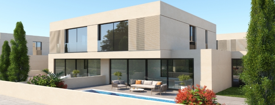 It has 3 bedrooms, 2 wc and 2 bath/showers. Main features include: Common pool, garden, ceramic tiles, double glazing, en suite bath/shower, granite kitchen, modern architecture, open plan layout, parquet bedrooms, photovoltaic for specific property, store room, water pressure system. Central Heating: provision for central heating. It also has a water heater working with : solar panels. The Energy Efficiency Class of the building is A. The House was constructed in Sep 2025. Τhe plot area is 150 square meters. Walking distance from: bank, pharmacy, hair dresser, beauty salon, corner shop, bakery, park, sea/beach. 5 minutes from: primary school, supermarket, childrens play area, Church, beach. View: swimming pool. The type of road leading to the property is tarmac secondary road. There is road frontage of 3312 meters.
