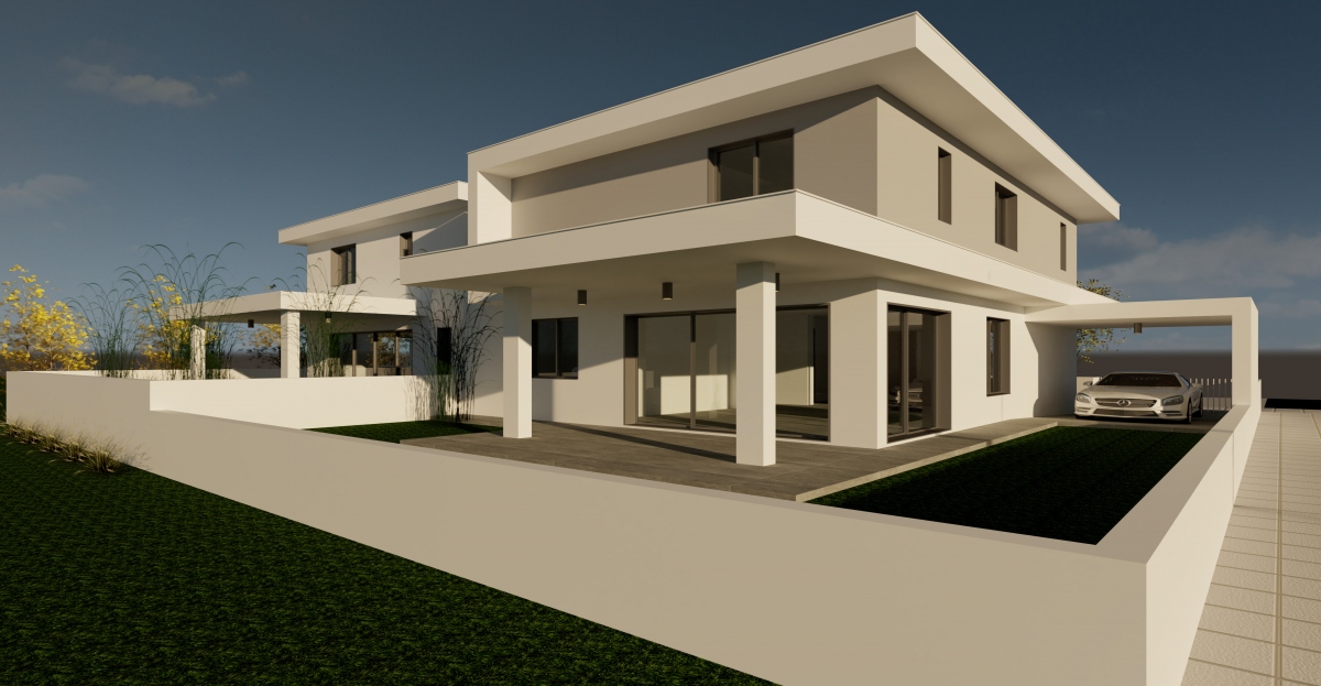 It has 3 bedrooms, 3 wc and 3 bath/showers. Main features include: Garden, store room, granite kitchen, study room, open plan layout, double glazing, gated parking, internet connection, modern architecture, en suite bath/shower, passive building (high energy efficiency), water pressure system, alarm system, photovoltaic panels (for producing electricity), strctured cabling. Central Heating: provision for central heating. The building has provision for air-conditioners. It also has a water heater working with : solar panels. The Energy Efficiency Class of the building is A. The House was constructed in Oct 2025. Electricity, via electricity poles, underground connection, Telephone, via telephone poles, underground cables, Water Connection, Connected to sewage system,Τhe plot area is 261 square meters. Walking distance from: hair dresser, beauty salon, corner shop, park. 5 minutes from: primary school, secondary school, supermarket, childrens play area, communal swimming pool, gymnastics center, Church. The type of road leading to the property is Private road. Situated in a cul-de-sac, that is a no end road, means that there is no traffic outisde your future house. Ideal for kids to play. The property has VAT (not included in the price).