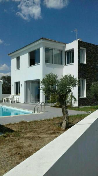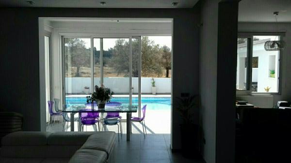 Has also appliaces including: Cooker, Extraction fan, Oven. It has 4 bedrooms, 3 wc and 2 bath/showers. Main features include: Private pool, garden, store room, granite kitchen, double glazing, ceramic tiles, modern architecture, en suite bath/shower, water pressure system, shutters, alarm system, barbecue, strctured cabling. Central Heating: heat pump. The building uses split-unit aiconditioners in each room. It also has a water heater working with : solar panels, electricity. The Energy Efficiency Class of the building is B+. The House was constructed in 2011. Τhe plot area is 678 square meters. The type of road leading to the property is tarmac secondary road. There is road frontage of 34 meters. The property has no VAT tax. This House has title deed ready. Has distance from main higway 3.0 km. Has distance from from sea or beach of 35 km. *** FOR SALE 4 BEDROOMS LUXURY VILLA. ***